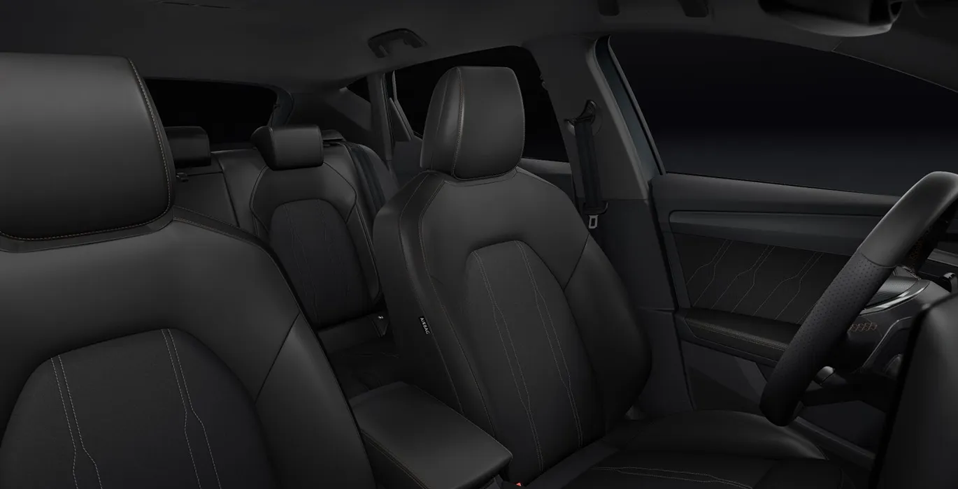 • Asientos delanteros deportivos con tapicería Sharp/PVC en color Negro con costuras en color Copper